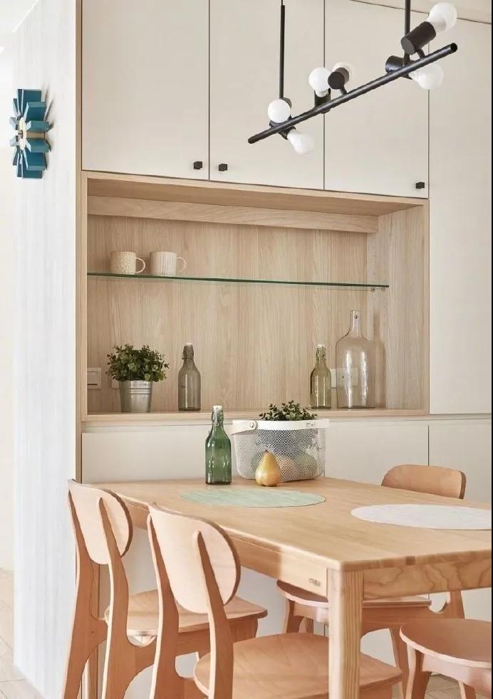 餐廳原木質(zhì)的餐桌椅,搭配上木質(zhì)感的餐邊柜,一串獨特的黑白配吊燈,整體顯得格外的精致時尚。
