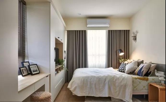 臥室空間較為緊湊,床尾的衣柜與電視柜組合起來的設(shè)計,顯得格外的實用又美觀。