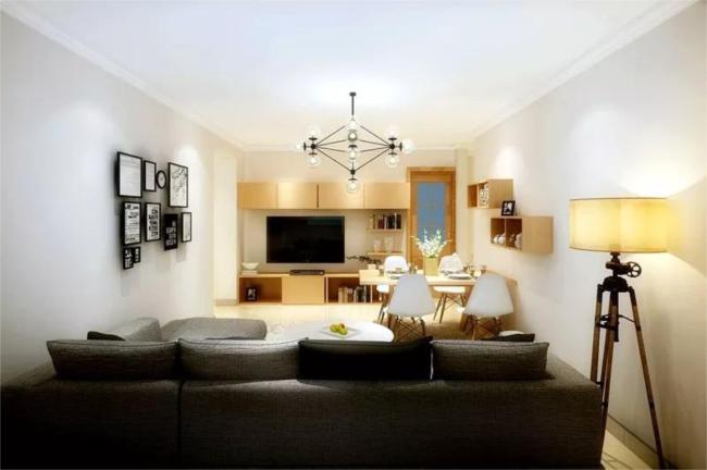 ▲客餐廳的設(shè)計(jì)以淺色調(diào)為主,采光不好所以整體空間采用象牙白色,電視墻進(jìn)行收納展示,由于房高有限,老人喜歡簡(jiǎn)單干凈的風(fēng)格,以石膏線過度,烘托整體家居氛圍。