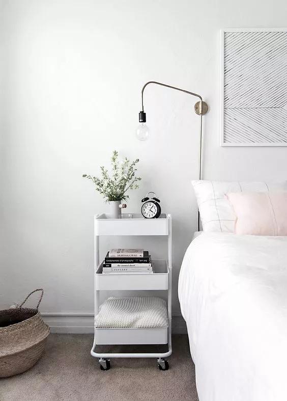 床頭不一定要放柜子,如果你是一個比較隨性的人,那么小推車完全可以代替?zhèn)鹘y(tǒng)意義上的床頭柜。它可以放置生活上或者辦公用的小物品,隨時移動,可以根據(jù)需求想放哪里放哪里,這就是能滾動家具的精妙之處,而且還會讓空間更通透,相信你一定會愛上它。