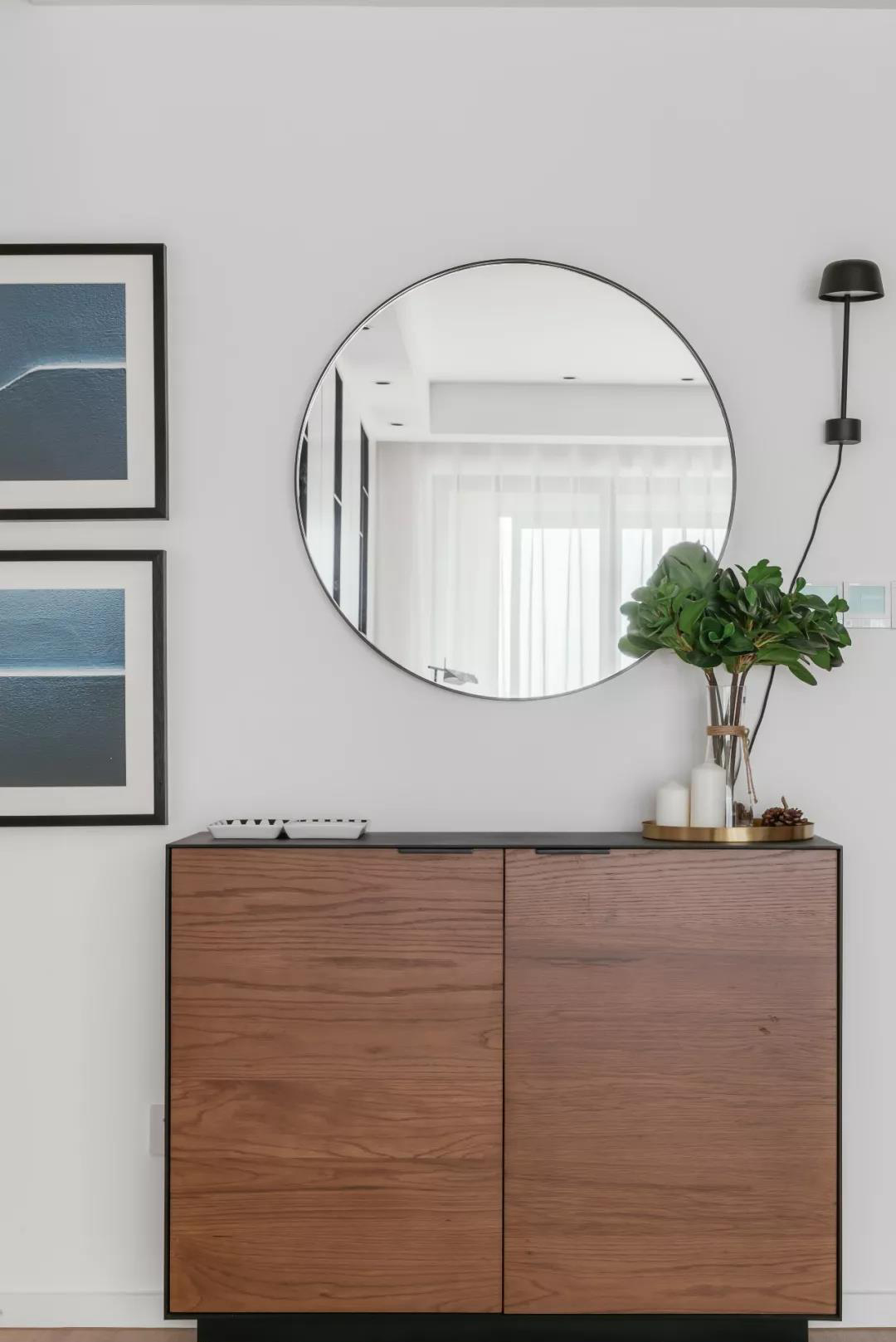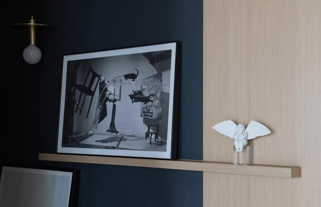 客廳深藍(lán)色的背景墻,比黑色更洋氣百搭,比灰色更深沉成熟,神秘冷峻的深藍(lán)色更能突現(xiàn)品質(zhì)感。 搭配淺色沙發(fā)、窗簾,層次豐富,簡約又不失設(shè)計感。 客廳不設(shè)置電視墻以書柜取代,可以增加家庭氛圍,也可培養(yǎng)家庭的閱讀習(xí)慣增加家人間的交流。 客廳書柜考慮到打理沒有做成全開放時間的,開放的地方用一公分黑色不銹鋼不同比例的分割來增加裝飾,不銹鋼也便于平時打理,和白色烤漆門板也形成對比。 |  過道  | 過道相對開闊,在臨近客廳處放置邊柜,上方懸掛鏡子以及裝飾畫組合可以增加生活氣息,同時鏡子不同角度反射出客廳的面貌也讓生活增加了一絲樂趣。