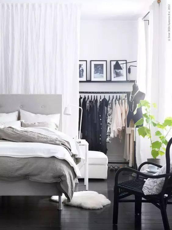 利用滑動(dòng)式窗簾,在臥室床的后面分割出一個(gè)衣帽間,即使是小戶(hù)型,也可以擁有步入式衣柜。