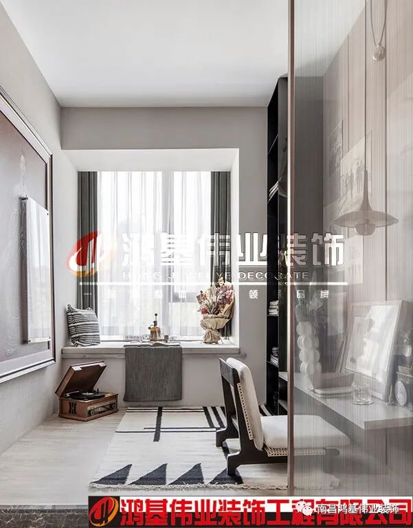 世界上的藝術(shù)具有相通性。音樂(lè)、書(shū)籍、品酒,形式縱有不同,也是對(duì)趣味和審美的精神向往。最好的時(shí)尚、最好的品質(zhì)生活,都應(yīng)如此。復(fù)古的金色飾品和燈具,傳遞出輕奢的氣質(zhì)。黑白色的窗臺(tái)書(shū)柜座椅,幾何形狀的地毯,現(xiàn)代摩登風(fēng)情撲面而來(lái)。書(shū)房中的掛畫(huà)、海報(bào),張貼的是大衛(wèi)鮑伊和披頭士,可見(jiàn)房主對(duì)音樂(lè)的癡愛(ài)。復(fù)古的攝影裝置,反映出的是良好的攝影品味。