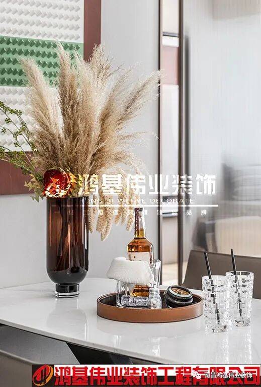 客廳墻壁上大大的唱片裝置,仿佛準(zhǔn)備隨時(shí)流出音樂(lè)。優(yōu)雅低調(diào)的絲絨布料家具,足見(jiàn)房主的藝術(shù)品味及對(duì)品質(zhì)感的追求。設(shè)計(jì)師精心布置的空間里,讓我們不禁思考藝術(shù)和生活的關(guān)系,說(shuō)到底,生活從不該缺乏藝術(shù),將生活作為藝術(shù)本身,本就是一件幸福滿滿的事。時(shí)尚精致的酒器,源于房主高雅的品酒品味。在古今中外源遠(yuǎn)流長(zhǎng)的酒文化里,品酒漸漸成為一種藝術(shù)。而空間中對(duì)金色的使用,微微透出奢華的質(zhì)感。