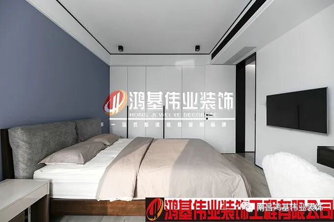 滿墻通頂?shù)拇笠鹿窨梢酝瑫r容納夫婦二人的衣物,純白色柜門大氣端莊,搭配黑色的線條把手美觀精致。電視背景墻一如既往的簡潔;用云朵絨椅的輕盈調(diào)和原木梳妝臺的厚重質(zhì)感相映襯,更顯時尚雅致。