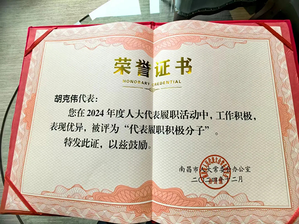 自擔任市人大代表以來,胡克偉始終以高度的責任感與使命感投身于人大代表工作,深入基層調研,傾聽民眾心聲,積極參與各類會議和活動,展現(xiàn)出了極高的工作熱情與專業(yè)素養(yǎng)。胡克偉說:“此次獲得這兩項榮譽,既是對過往人大履職工作的認可,更是一份沉甸甸的責任與鞭策。在未來的人大履職工作過程中,會繼續(xù)秉持初心,扎根基層,深入挖掘人民群眾在各個生活領域面臨的實際困難。力求提出更多兼具深度與可操作性的建議,為南昌高質量發(fā)展添磚加瓦,貢獻人大代表的力量!”