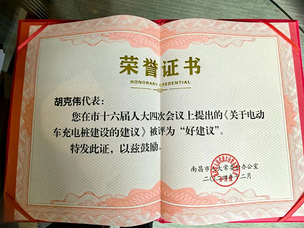 因工作積極,表現(xiàn)優(yōu)異,胡克偉獲得2024年度“代表履職積極分子”榮譽表彰。提出的«關于電動車充電樁建設的建議»給出了一系列切實可行的實施舉措。該建議經(jīng)過層層篩選與嚴格評審,最終被評為“好建議”。