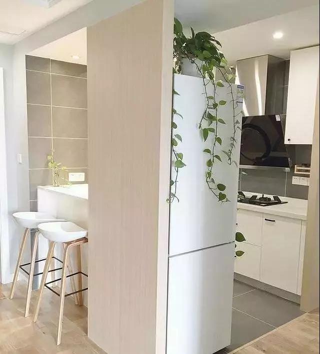 開放式的廚房,還有一個(gè)吧臺(tái),冰箱放在廚房旁邊,也算是個(gè)半隔斷,非常巧妙的設(shè)計(jì)。