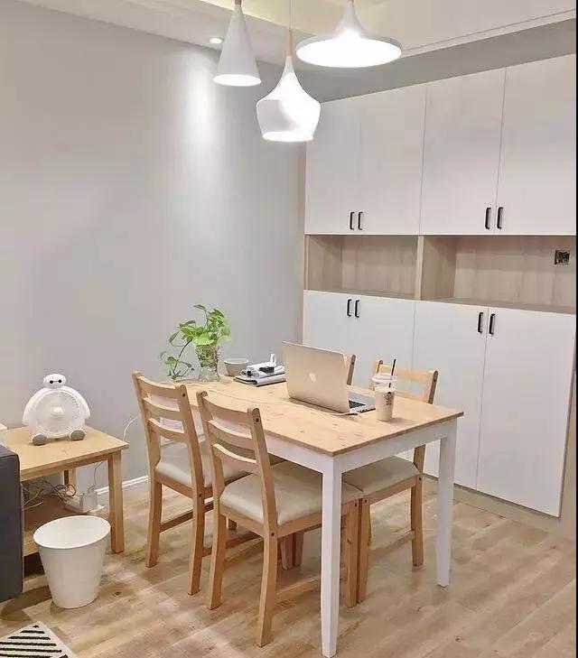 往里走就是餐廳了,原木色的餐桌看起來特別舒服,當(dāng)然還有個(gè)嵌入式的實(shí)用餐邊柜。