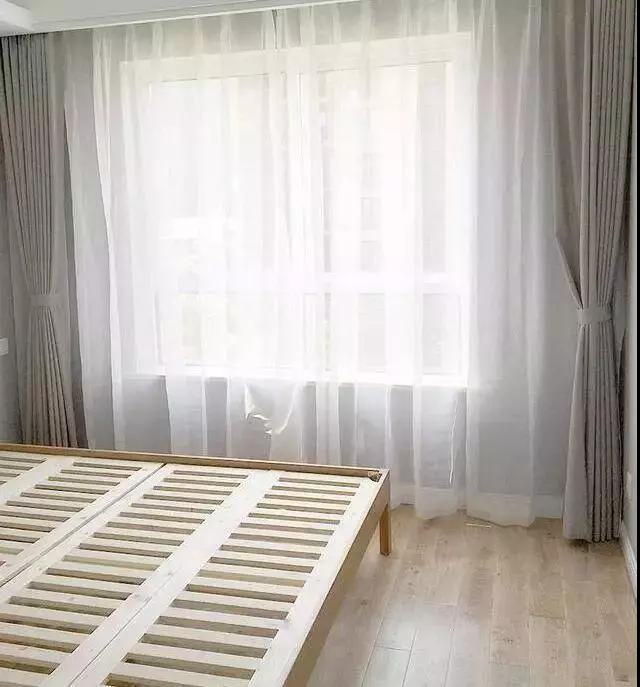 窗簾和客廳的是一樣的,原木色的床,給人回歸自然的感覺。