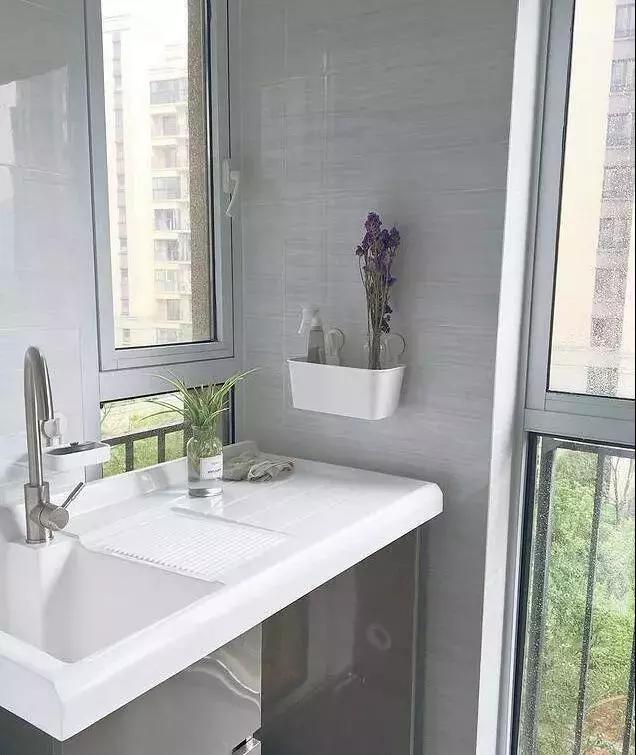 陽臺(tái)是生活陽臺(tái),一邊打了柜子,另一邊做的是洗衣池,洗衣曬衣都在這里完成。
