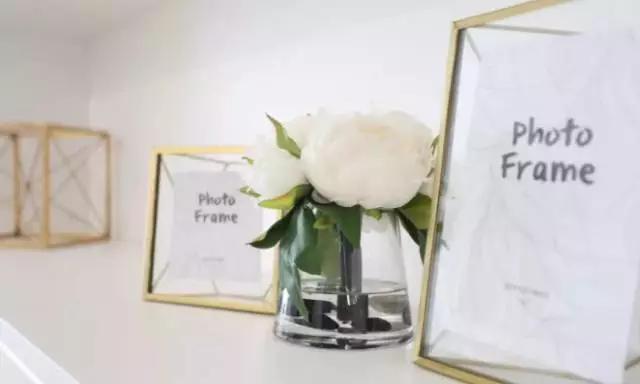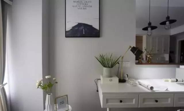 ▲ 書房白色家具搭配墻面的黑色簡框畫與臺燈,形成黑白灰的基調(diào),金色元素與綠植,呈現(xiàn)清新質(zhì)感的空間
