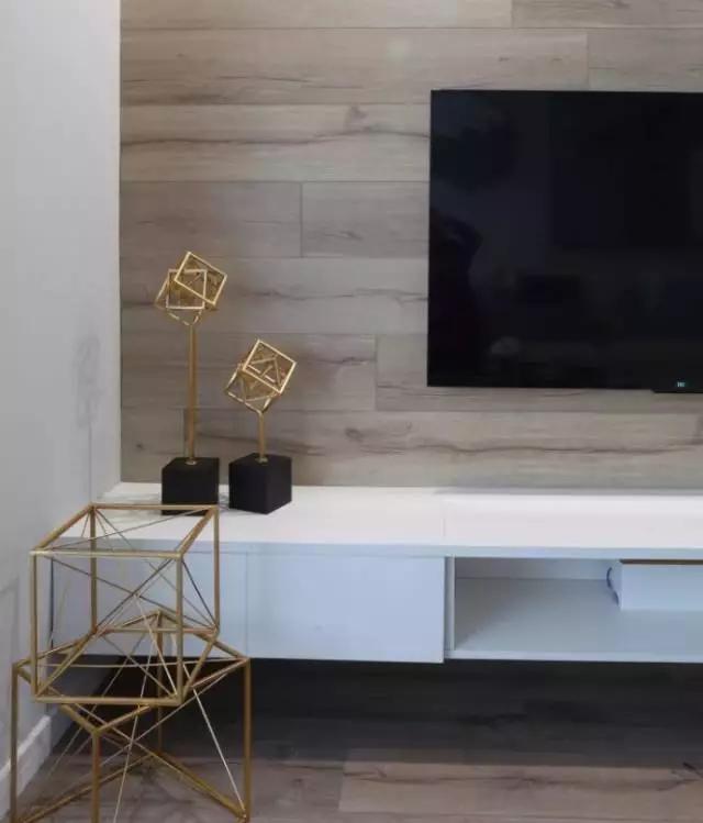 ▲ 將木色地板鋪貼上墻的方式,打造出自然有溫度的電視背景,白色架空電視柜,簡約的同時也讓地面賦有延伸感
