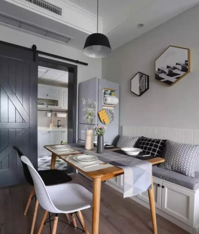 ▲ 餐廳地面延續(xù)木質(zhì)地板鋪貼,一張原木餐桌,搭配黑白色的埃姆斯椅,結(jié)合儲物卡座的設(shè)計,節(jié)約空間的同時可容納更多人聚餐