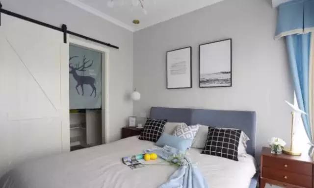 ▲ 藍(lán)灰色的布藝大床,搭配灰藍(lán)色系軟裝,黑色靠枕與背景墻的簡框畫相互呼應(yīng),白色谷倉門是步入式衣帽間的入口,掛上麋鹿門簾,讓空間顯的活潑有生趣