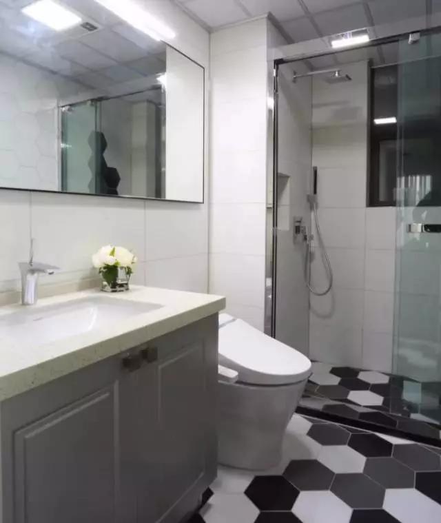 ▲ 衛(wèi)生間淺色墻磚,搭配地面黑白灰三色六角磚鋪貼,顯得靈動而獨(dú)特,玻璃淋浴房盡量讓空間做到干濕分區(qū)
