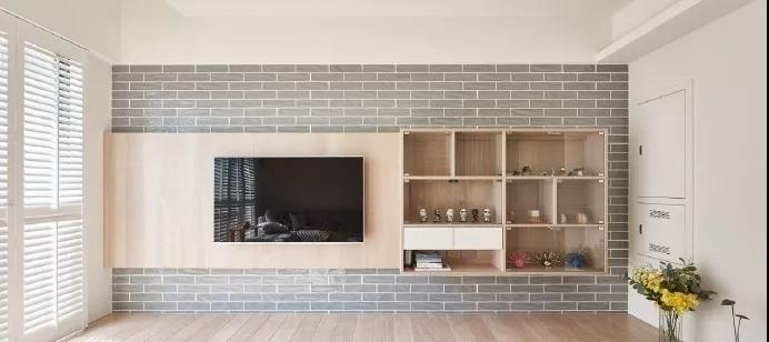 電視墻以灰色的啞光平面磚張貼,中間部分是木板掛上電視機,顯得簡潔而大方,結(jié)合側(cè)邊的收納展示柜,布置上精致的擺飾,顯得格外的優(yōu)雅時尚。