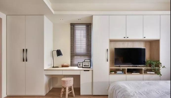 臥室空間較為緊湊,床尾的衣柜與電視柜組合起來的設(shè)計,顯得格外的實用又美觀。
