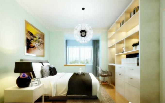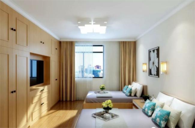 ▲老人房由于年齡較大,睡覺輕,兩人睡覺喜歡分床,這是獨(dú)居老人房設(shè)計(jì)的最大特點(diǎn)。色調(diào)以米黃色為主,燈光柔和安靜,老年人重收納,所以做整面墻體的收納柜,老人床頭燈的設(shè)計(jì),讓老人起夜更方便,貼心設(shè)計(jì)。