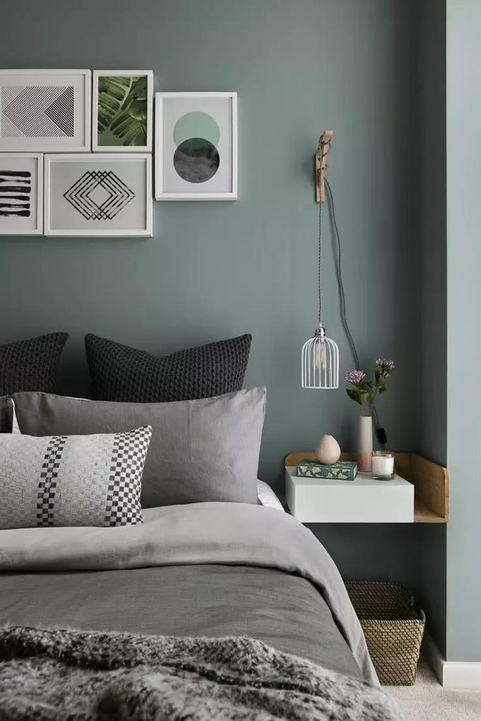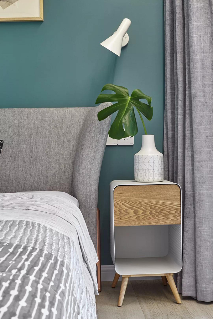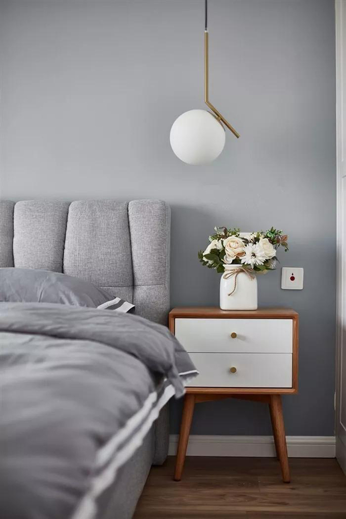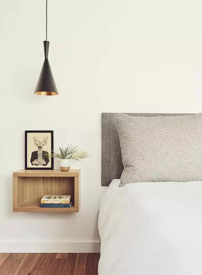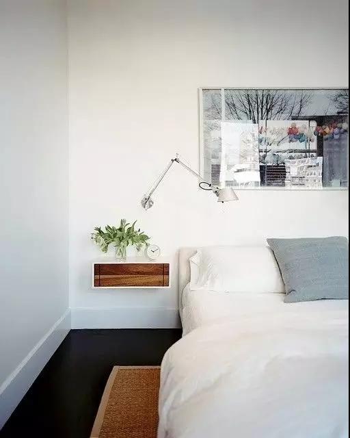 如果由于戶型的原因,放完床后,完全沒有床頭柜的位置,可以考慮讓這個收納設(shè)計上墻,因為不只有地上的床頭柜才有收納功能,把床頭一邊或者兩邊的墻上設(shè)計一個能收納又能裝飾的置物架,或者置物框。比起普通的床頭柜,掛在墻上的小巧壁柜完全不占空間,剩余空間可以給其他家具。