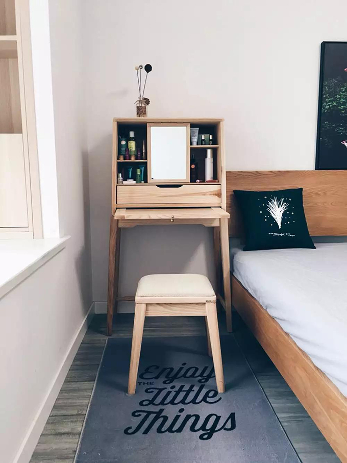 小茶幾、凳子、化妝臺也同樣適用于床頭。相對傳統(tǒng)的笨重床頭柜,這樣小巧輕盈的設(shè)計,不占太多的空間,基本的收納完全沒問題。最重要的是,相比普通的床頭柜,這些小臥室小家具變成了裝飾品的一種,簡直太完美了。