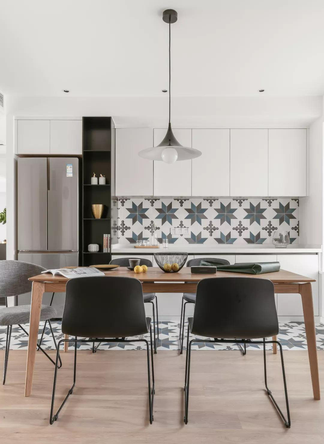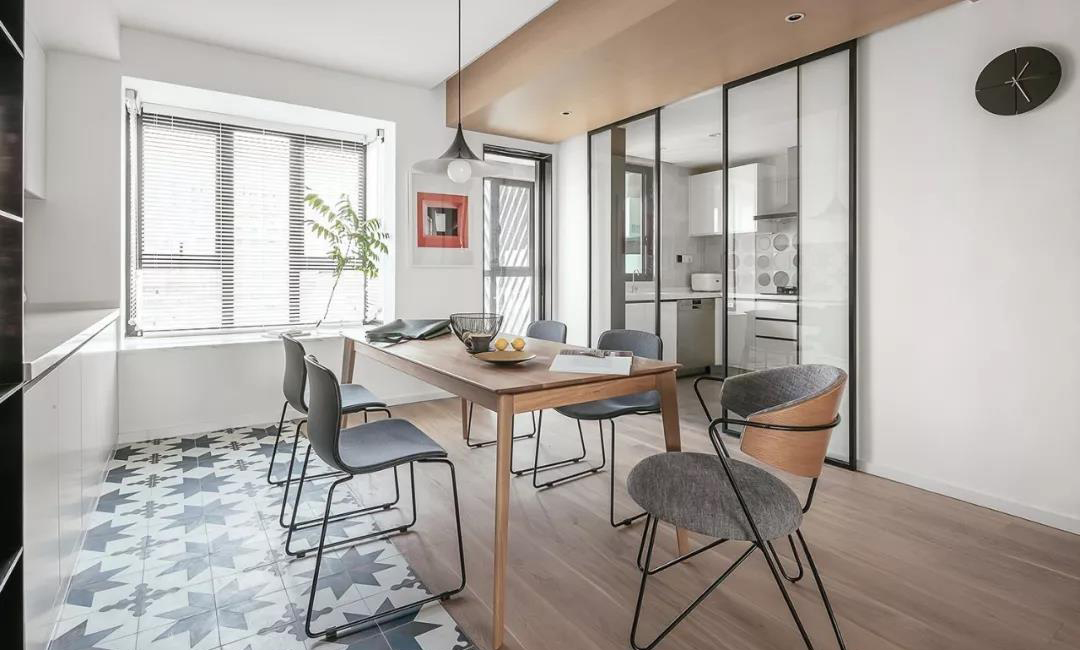 |  餐廳  | 原來廚房餐廳的比例不適合居住需求,在縮小廚房增加餐廳的同時,廚房的大梁成了吊頂?shù)恼系K,所以以木梁的方式將頂面進行切割,并延伸至客廳,將梁轉(zhuǎn)換成裝飾,再結(jié)合三段等比例的木塊形成了玄關(guān)的背景。 餐廳最初看上了見南花的花磚,于是由餐廳墻面延伸至地面,地面再結(jié)合地板,形成比較好的裝飾面,地板和地磚結(jié)合的地方不宜使用大壓條,可以設(shè)置實心不銹鋼條在地板和地磚之間收口。