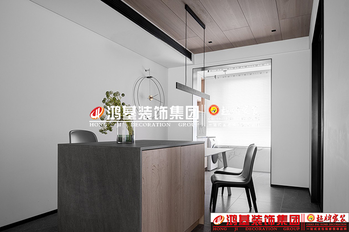 圖3.4.亮點(diǎn):餐廳以獨(dú)特的條形吊燈和掛鐘來(lái)烘托空間氛圍,使用餐桌+島臺(tái)一起設(shè)計(jì),這樣不僅可以擴(kuò)展操作臺(tái)充當(dāng)餐桌輔助,也可以作為作為閱讀辦公區(qū)域使用。廚房以實(shí)用為先,使用了常用的“L”型布局,充分利用拐角地帶,實(shí)現(xiàn)空間利用率的最大化。