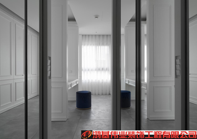 公共領(lǐng)域進(jìn)主臥的窄門(mén)廊兩側(cè)作了鏡面,用視覺(jué)反射放大寬度、減少壓迫感,女主人在設(shè)計(jì)之初,就表明希望有包包展示的空間,于是在廊道單邊作為包包展示,另一邊作收納。主臥中央的H型裝置頂天立地,其實(shí)是珠寶展示兼化妝臺(tái),以及睡臥、更衣場(chǎng)域的區(qū)隔體。