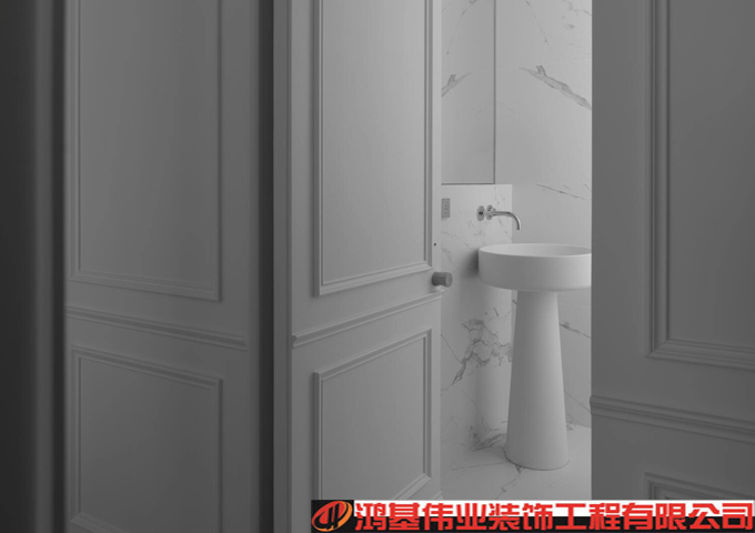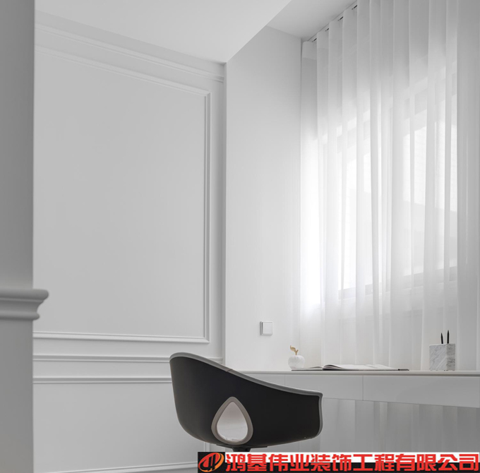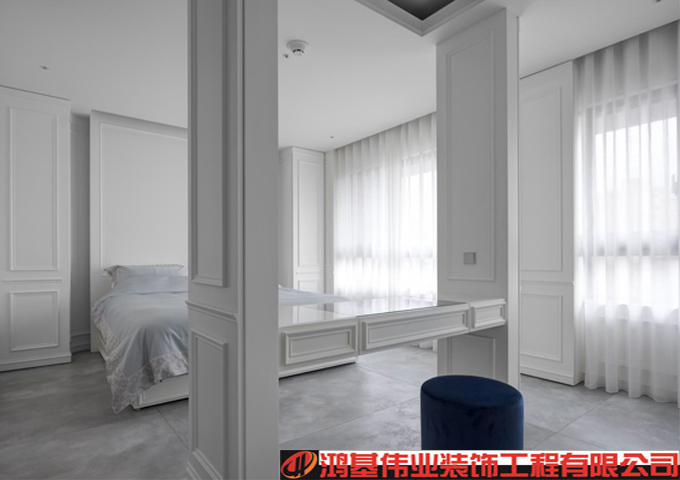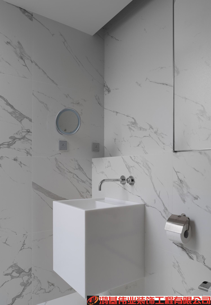 這個(gè)案子配有兩個(gè)洗浴空間,從一圓、一方的洗手臺(tái)差異巧思作變化,客浴洗手臺(tái)為圓盤(pán)+圓錐柱造型,鏡子以?xún)?nèi)凹方式處理,與墻面合而一; 主臥浴室則以人造石訂制,懸浮式臺(tái)面具有設(shè)計(jì)感。兩組空間最大的共通點(diǎn)就是極簡(jiǎn)、極凈白,設(shè)計(jì)師選用白色天然紋理系列的石英磚,連同浴廁柜面全面鋪設(shè),并把所有磚片接縫減至最小,其它把手、設(shè)備則精簡(jiǎn)化處理,雖然感覺(jué)抽象,但所有機(jī)能不減,空間中看不到多余的水管線路甚至是設(shè)備,為的就是創(chuàng)造藝?yán)鹊燃?jí)的視覺(jué)空間維度。