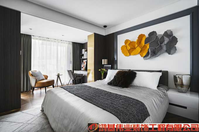 臥室延續(xù)輕奢基調(diào),以木質(zhì)材料和金屬的碰撞營造空間的藝術(shù)感和精致感,并以淺色柔軟的床品營造靜謐、舒適的氛圍,讓居者負重前行的身體與靈魂得到徹底地放松。