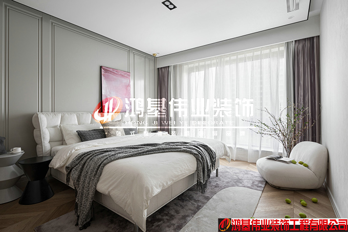 次臥是黑白灰的色系,整個(gè)空間是中性而穩(wěn)重。
