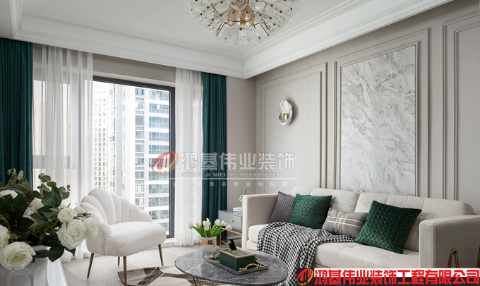 業(yè)主小姐姐性格溫和而又熱情,一旦把事情交給專業(yè)的工作人員,她總會展現出充分的信任,給足安全感,毫不吝嗇自己對身邊人的贊美,讓項目經理也經常忍不住為她點贊。這么多buff的加持讓這個家的設計和施工都進行得井然有序。以稍顯高冷的灰色為背景,點綴悅動的青椒綠,此時的空間于沉靜中醞釀著富饒的活力,又在清透優(yōu)雅的視感中匯聚著內斂謙和的溫潤質感,仿如一位閑庭信步的Lady,穿梭于精致與時尚之間,打造出輕奢典雅的格調視感。客廳精致的細節(jié)中透露出一絲浪漫的復古情調,落地窗使光線貫穿著整個空間,看出去的視野開闊通透。墻面的線條元素采用了非傳統(tǒng)的排列方式,加上仿石材紋理的點綴,既復古又特別,和現代感的家具搭配也相得益彰,在傳統(tǒng)與創(chuàng)新之間找到了一個平衡點。