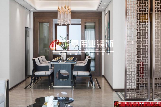 設(shè)計(jì)理念:設(shè)計(jì)是生活和藝術(shù)交融所產(chǎn)生趣味,喚醒業(yè)主對(duì)家、對(duì)生活最本真的熱愛(ài)。此案空間以暖色調(diào)為主, 通過(guò)黃銅、木飾面、大理石等材質(zhì),搭配既具自然風(fēng)味又現(xiàn)代精致,貼合居者對(duì)生活的需求、對(duì)美學(xué) 的向往,賦予品位生活細(xì)膩的優(yōu)雅。理想的藝術(shù)空間,并不是為了空間才添加藝術(shù)品,而是在空間里就能創(chuàng)造藝術(shù)。青山若隱的嶺南山水,并將傳統(tǒng)中式書院設(shè)計(jì)巧妙融入空間,以端正優(yōu)雅為基本調(diào)性,再融入流動(dòng)的、 洋溢線條美的金色元素,為空間鋪墊輝煌氣韻。沉穩(wěn)的沙發(fā)及恬靜的休閑椅再加上黑色茶幾將整個(gè)空間的典雅氣質(zhì)融合起來(lái),增加了幾分輕松與雅致,略帶東方氣息的掛畫,很好的迎合了整體氛圍,令空間回歸東方。 設(shè)計(jì)師對(duì)于品質(zhì)的呈現(xiàn)有著極致的追逐。精致的餐椅主要以黑白為主調(diào),表明了悠悠山水主題, 高低起伏的吊燈,整體營(yíng)造出視覺(jué)上的美感。極具沉靜感的深灰作為空間的主調(diào),質(zhì)感沉厚的現(xiàn)代家具,抽象時(shí)尚的藝術(shù)裝置,流散出新奇而前衛(wèi)的藝術(shù)氣息。簡(jiǎn)約而凝練的山水元素,肆意糅合于室內(nèi)各處,行構(gòu)出冷靜非凡的氣質(zhì),帶來(lái)多重感官體驗(yàn) 沉穩(wěn)的灰調(diào)、潔凈的白色、極具質(zhì)感的深綠色,在富有節(jié)奏層次的韻律中寫就冷靜而簡(jiǎn)雅的氣質(zhì)。將銀河白的雅和都市灰的時(shí)尚作為空間的主要裝飾色,穿插綠色象征青山綠水的自在,尋那一絲原汁原味,穿插黃色,象征那悠悠活力,以現(xiàn)代分隔比例將室內(nèi)空間以輕松簡(jiǎn)約的形式呈現(xiàn),將文化融入其中, 將氛圍提升到溫暖之外的精神享受。