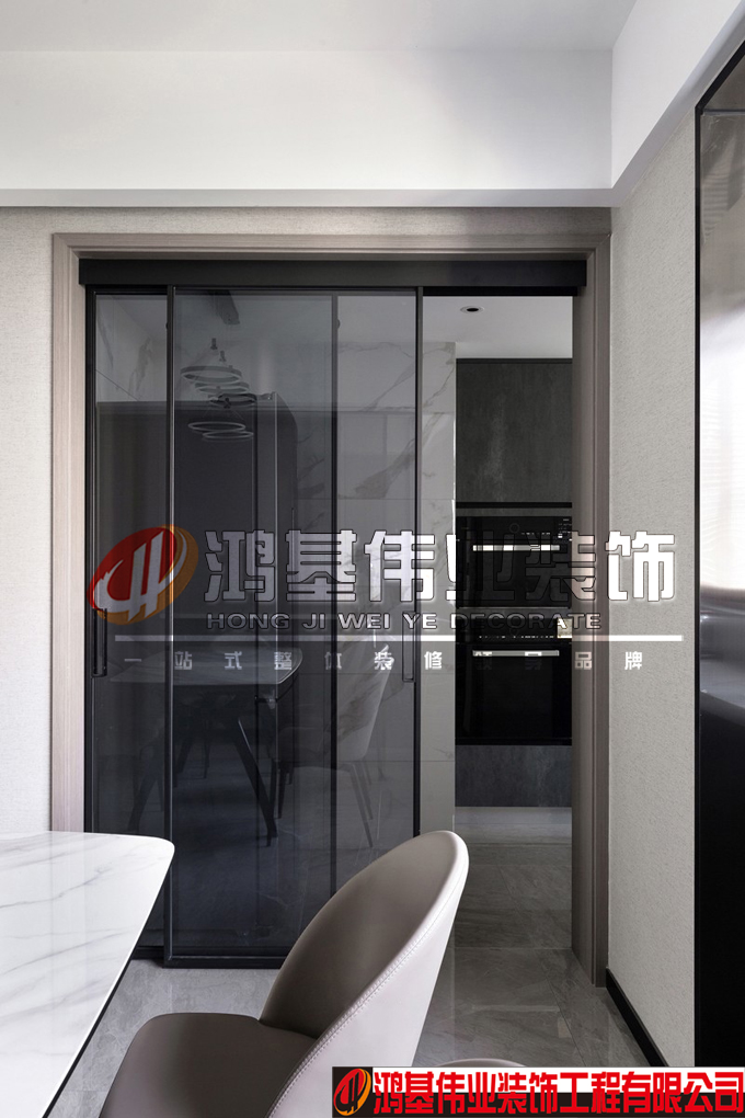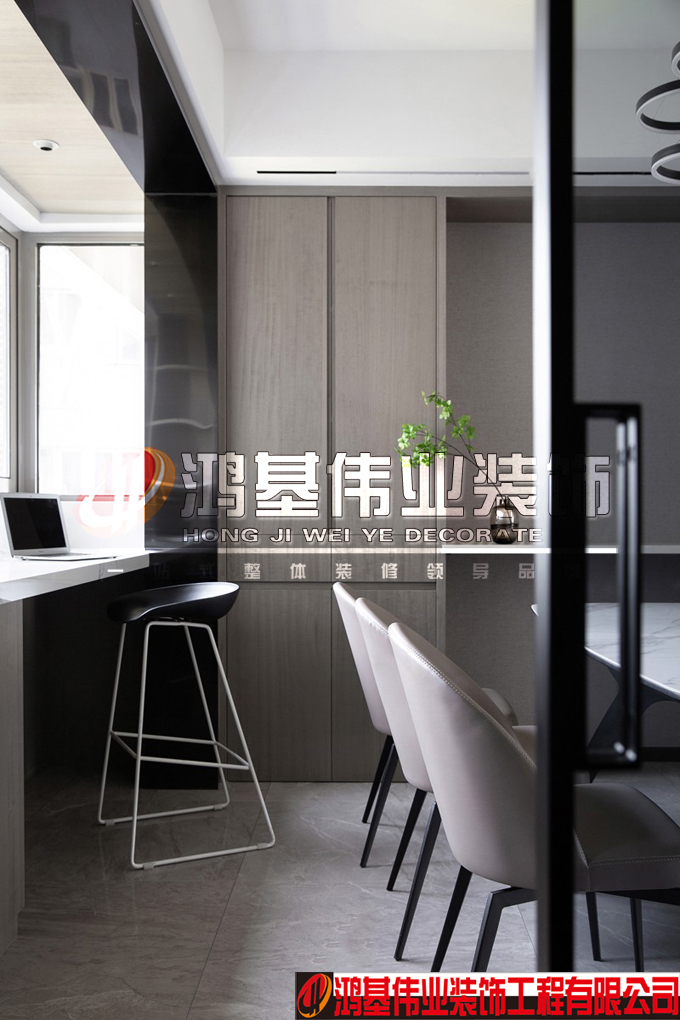 設(shè)計(jì)理念:有很多的設(shè)計(jì)手法可營(yíng)造現(xiàn)代臺(tái)式之感覺(jué),我們更強(qiáng)調(diào)感覺(jué)、體驗(yàn)而非風(fēng)格,大概可歸結(jié)于“7”字設(shè)計(jì)法,通過(guò)“方向性”“分色”來(lái)完成一個(gè)玄關(guān)背景的空間立面,不會(huì)顯得過(guò)于生硬,通過(guò)幾個(gè)“轉(zhuǎn)折”構(gòu)思出整 體的空間視覺(jué)感。 我們將頂面與墻面的關(guān)系通過(guò)燈帶線架構(gòu)在一起,空間中不同的材質(zhì)可完成一個(gè)很好的過(guò)渡作用,隨之用玄關(guān)背景的黑色“7”字與之形成呼應(yīng)。 為了使整體空間協(xié)調(diào)穩(wěn)定,我們也將風(fēng)口做了黑色覆蓋處理,也能更好地表達(dá)空間中的層次調(diào)理關(guān)系。吧臺(tái),工作的地方,我們打造的是一種生活方式,不同功能設(shè)計(jì),帶來(lái)不同的動(dòng)線,只為讓屋主的生活方式更具多樣化。  可塑且多變的“金屬”因其自身特性,常常制造出有趣的“鏡像”,也是充滿未來(lái)感的材質(zhì)之一。這是本案中出現(xiàn)的最跳躍的顏色,也是唯一一個(gè)空間跳色,也表明了屋主的個(gè)性。 富于變化和著色的“玻璃”有著凜冽氣息,自帶一種脆弱的美感。