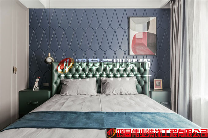 主臥,藍(lán)色為基調(diào),黑白灰紅四色藝術(shù)掛畫的出現(xiàn),很好的緩解了大面積藍(lán)色帶來(lái)的視覺(jué)疲勞,整個(gè)空間呈現(xiàn)出一種自帶濾鏡的高級(jí)色調(diào),優(yōu)雅而迷人。有趣的靈魂也需契合之物裝扮,走心醞釀出的精妙為浪漫代言。