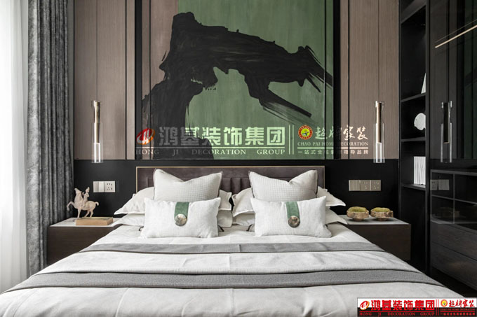 圖7.:主臥空間巨幅的水墨抽象藝術(shù),將主臥的色彩賦予一種情緒,精細(xì)銀色紋路的邊柜充滿現(xiàn)代動(dòng)態(tài)的潛能,每一筆細(xì)節(jié)都光彩亮麗,充滿現(xiàn)代風(fēng)格的床頭柜搭配透明的細(xì)長床頭燈,它們交錯(cuò)、并合激烈地爭(zhēng)取著空間,出現(xiàn)多層的材質(zhì)變化。